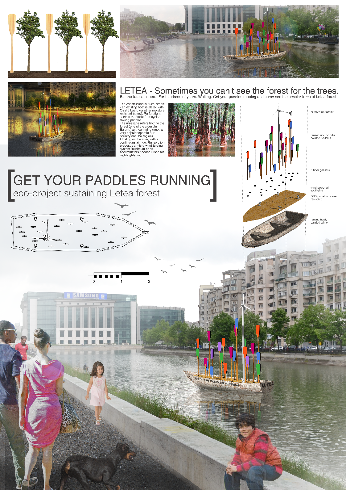 The construction is quite simple: an existing boat is plated with OSB 3 board (or other moisture resistant board). Perforations sustain the “trees” – recycled rowing paddles. The message refers to both forest (one of the oldest in Europe) and canoeing (once a very popular sport in our country and the region). Floating on the river, with a continuous air flow, the solution proposes a micro wind-turbine system (minimum or no accumulators needed) used for night-lighting.