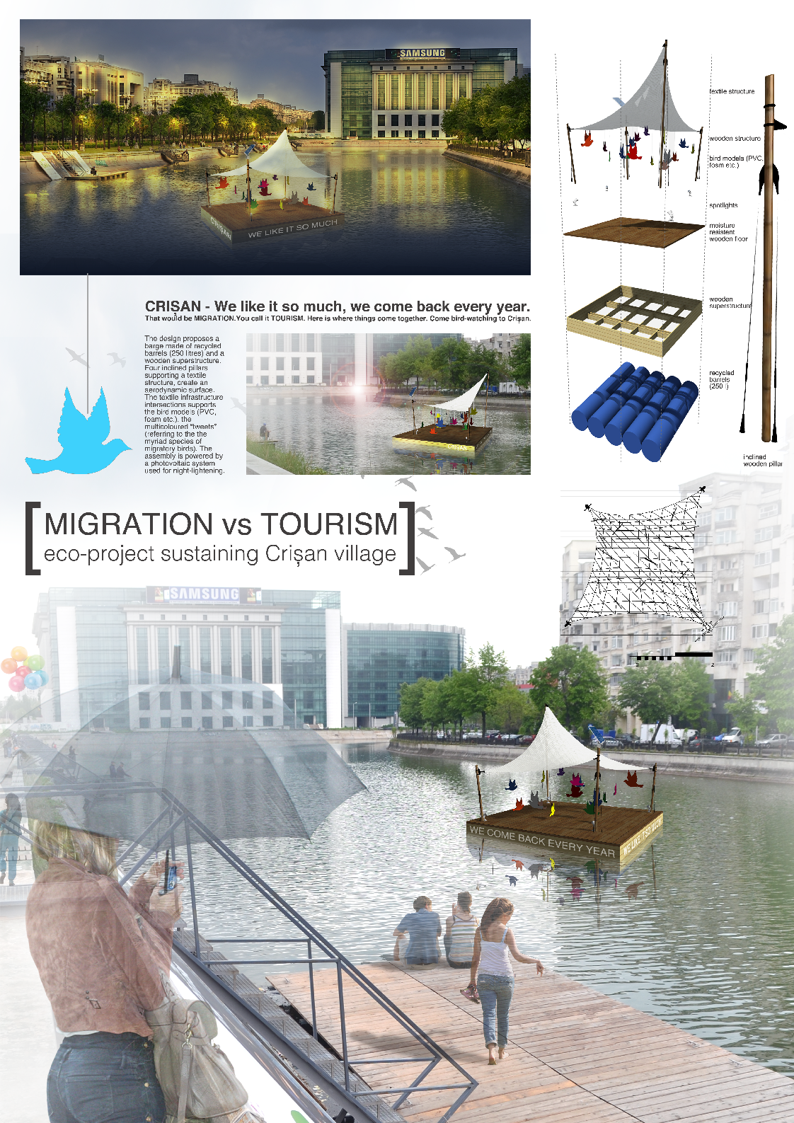 The design proposes a barge made of recycled barrels (250 liters) and a wooden superstructure. Four inclined pillars supporting a textile structure, create an aerodynamic surface. The textile infrastructure intersections supports the bird models (PVC, foam etc.), the multicolored “tweets” (referring to the the myriad species of migratory birds). The assembly is powered by a photovoltaic system used for night-lighting.